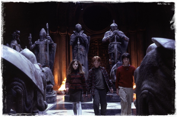 Ailesinin masum bir trafik kazasında ölmediğini öğrenen ve büyük düşmanı Kim-Olduğunu-Bilirsin-Sen’den haberdar olan Harry, küçük yaşına rağmen okuldaki ilk senesinde kendisini belanın içinde buluyor fakat arkadaşları, zekası ve cesaretiyle büyük başarılar elde ediyor. Troller ile dövüşülüyor, 3 kafalı dev köpekleri alt ediliyor. Filmin en sevdiğim bölümlerinden bir tanesi Büyücü Satrancının oynandığı kısım. Küçükken beni bu kadar etkilemeyen bu sahne, ilerleyen yıllarda öğrendiğim ve oynamaktan çok keyif aldığım satranç sayesinde daha anlamlı ve keyifli geldi. Lord Voldemort’un kaybettiği gücüne tekrar kavuşmasını sağlayabilecek Felsefe Taşı’na ulaşması Harry tarafından engelleniyor ve Potter bir kez daha karanlık lordu alt etmiş oluyor, tıpkı bebekken yaptığı gibi. Profesör Quirrell’in bedeninde bir parazit gibi yaşayarak eski gücüne kavuşma telaşı içinde olan Voldemort ile karşılaşma Harry’nin gelecekte daha büyük mücadeleler içinde olacağının bir sinyali gibi adeta.
